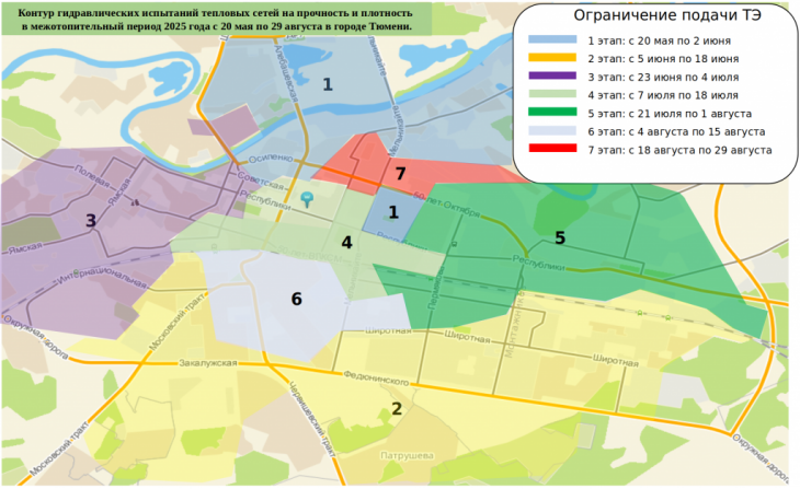 В 2025 году ежегодные отключения горячего водоснабжения в Тюмени пройдут в 7 этапов. Каждый из них займет от 12 до 14 дней. Работы в рамках подготовки к отопительному периоду 2025 – 2026 запланированы с 20 мая по 29 августа.