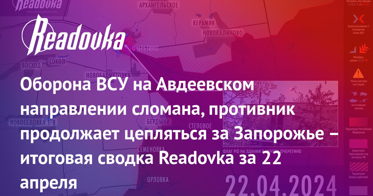 Заход русской армии в Очеретино, ненасытный Зеленский и бесперспективность борьбы с Россией — итоговая сводка Readovka с фронтов и внешнеполитического контура за 22 апреля