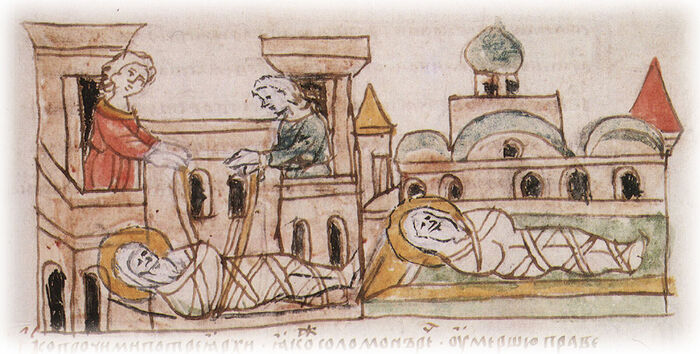 Тайное погребение Владимира Святославича, умершего в Берестове: спуск его тела на землю на ковре между разобранными клетьми здания; положение тела Владимира в мраморный гроб в церкви Святой Богородицы. Радзивиловская летопись