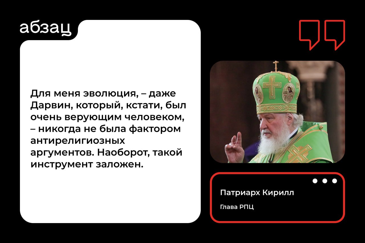 «Бог создал потрясающую Вселенную, он вложил в нас способность к развитию. Вот иногда говорили, что эволюция против Божьего замысла, – она не против Божьего замысла, а свидетельствует о невероятном Божественном замысле, когда человек своими силами, опираясь на внешние факторы, может развиваться таким образом, как это произошло в результате эволюции», – сказал патриарх Кирилл во время визита в лабораторный комплекс научно-технологического университета «Сириус».