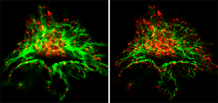 Рисунок 5. Две стратегии получения изображений со сверхвысоким разрешением. При направленном считывании данных (а) каждая точка образца облучается светом с особым распределением интенсивностей, так что все молекулы вокруг данной точки оказываются в темновом состоянии. Это уменьшает размеры участка с молекулами во флуоресцентном состоянии и, следовательно, функцию рассеяния точки. Для увеличения скорости сканирования образца можно применить распределение интенсивностей в виде линий с максимумами и нулевыми значениями (правый нижний угол). Для высокого разрешения по всем направлениям необходимо несколько раз повернуть паттерн освещения. При стохастическом считывании данных (б) индивидуальные молекулы переключаются между флуоресцентным и темновым состоянием. Интенсивность возбуждающего света подобрана так, что флуоресцирующие молекулы окружены молекулами в темновом состоянии. Если флуорофор яркий, можно очень точно определить его локализацию. в — Сравнение изображений, полученных с помощью оптической микроскопии и технологий сверхвысокого разрешения: слева — меченный антителами виментин, справа — микротрубочки (зеленые) и пероксисомы (красные) в клетках млекопитающих.
