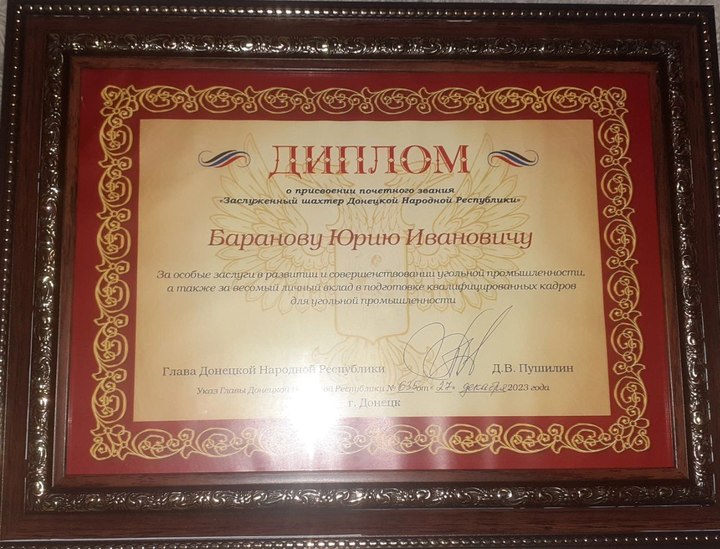 Юрий Баранов за 58 лет работы и за многочисленные заслуги получил награду “Заслуженный шахтер Донецкой Народной Республики”, которую ему присвоил Глава ДНР Денис Пушилин в преддверии его 90-летнего юбилея.