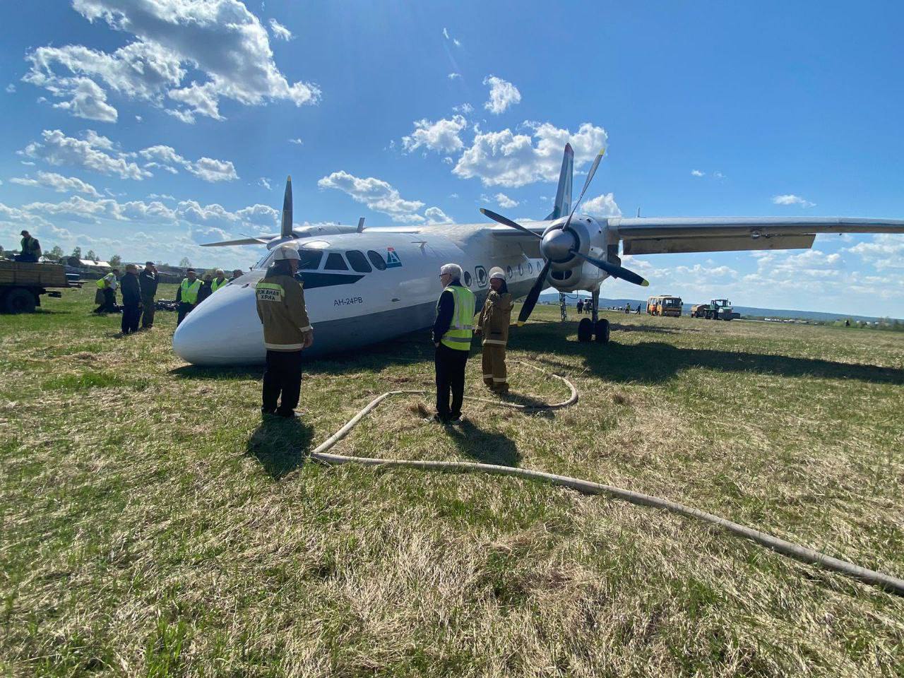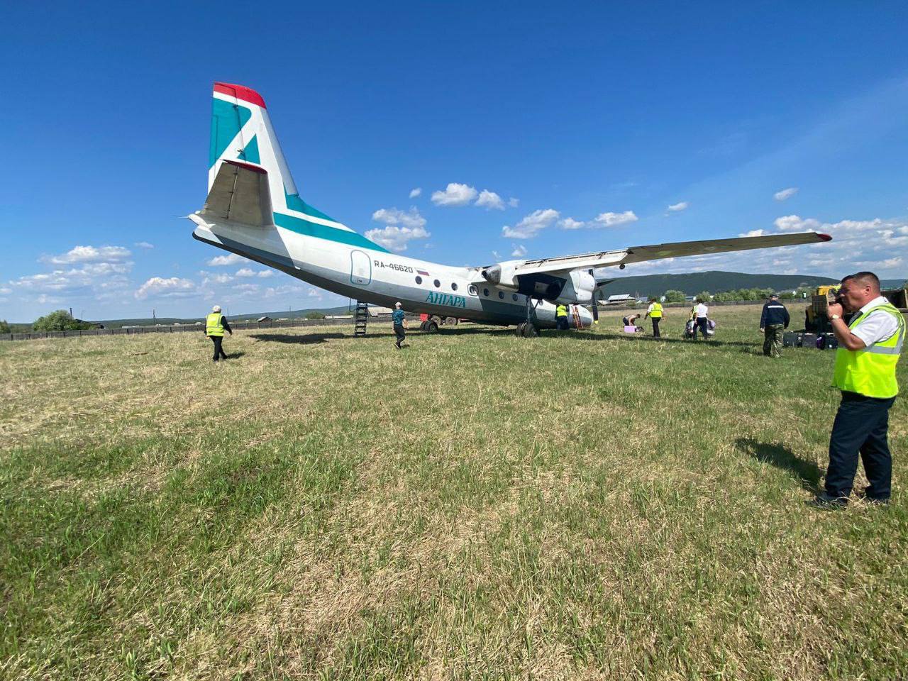 У самолета Ан-24 при посадке в иркутском Киренске сложилась передняя стойка шасси, он выкатился за пределы ВПП.