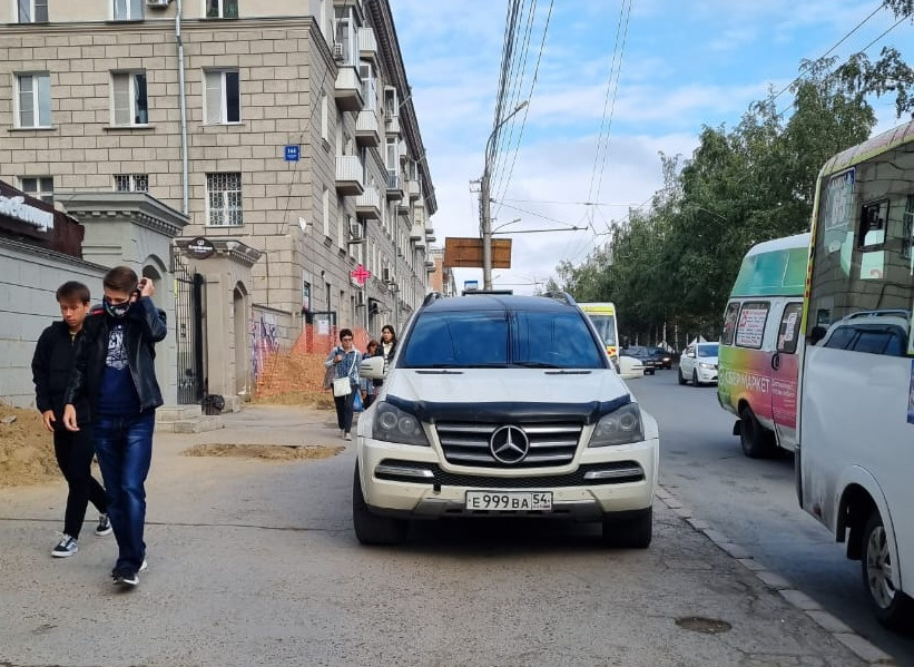 Красный проспект в районе площади Калинина. Белый Mercedes GL комфортно расположился на тротуаре, заняв половину пешеходной дорожки. Люди вынуждены обходить кроссовер. Комфортная среда? Не, не слышали.