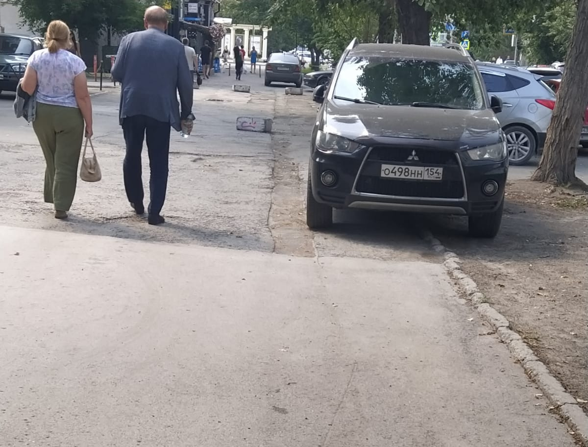 Тротуар на улице Орджоникидзе, напротив сквера перед НОВАТом. Из доступных мест для стоянки рядом — только платная парковка, поэтому водитель долго думать не стал и бросил машину на пешеходной дорожке.