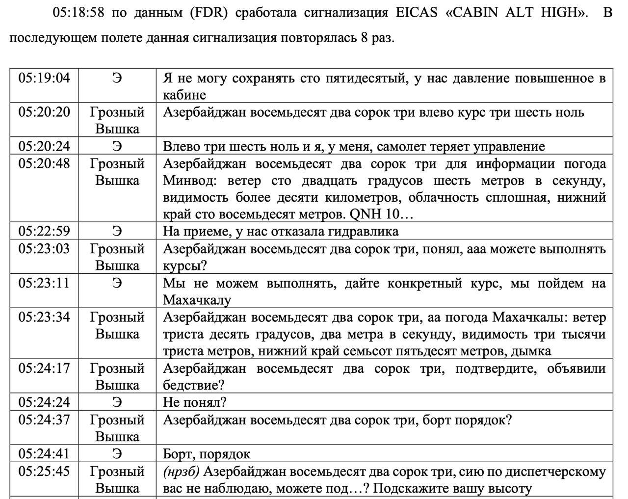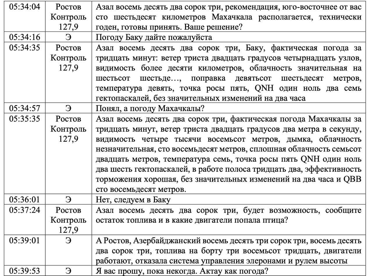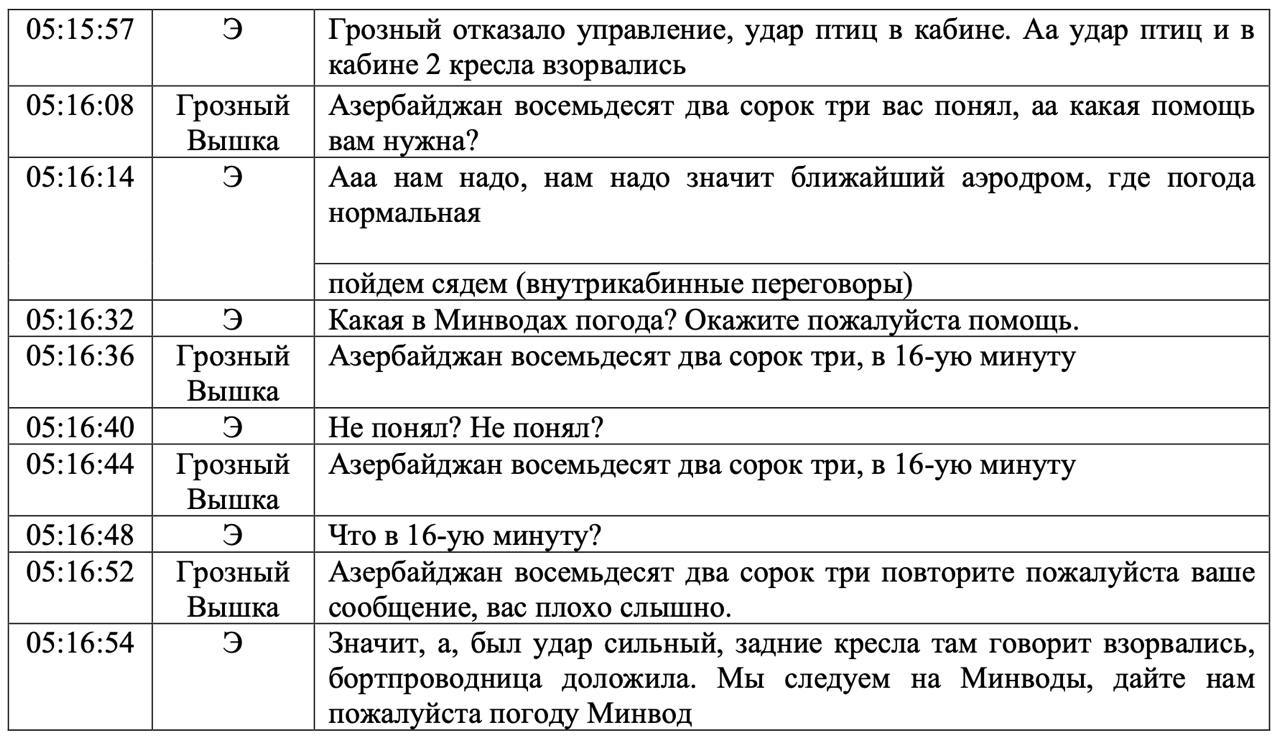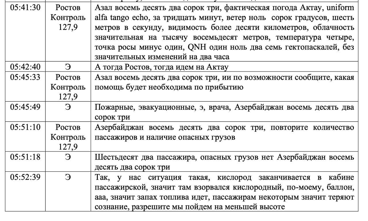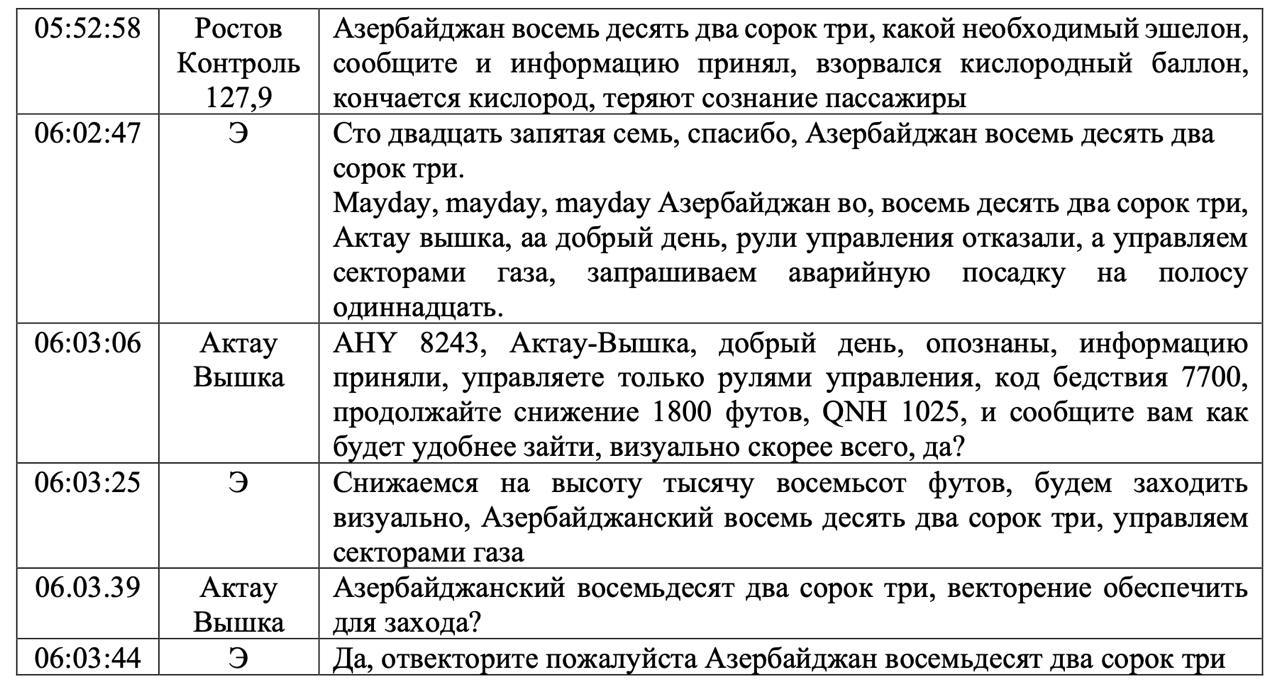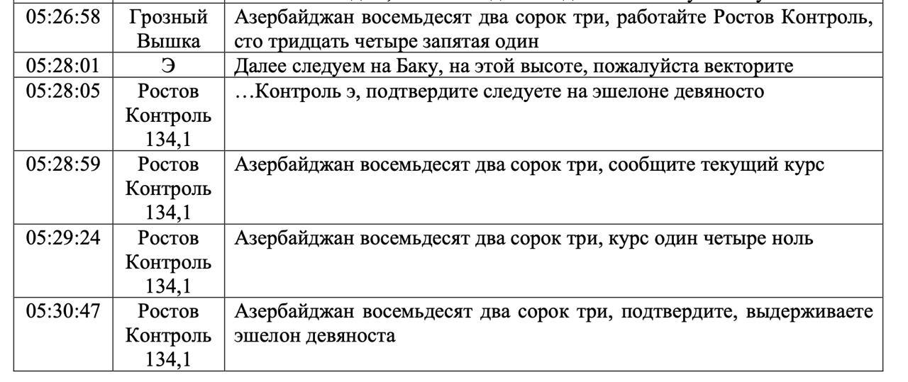 На фото — расшифровка переговоров экипажа и пилотов самолёта "Азербайджанских авиалиний".