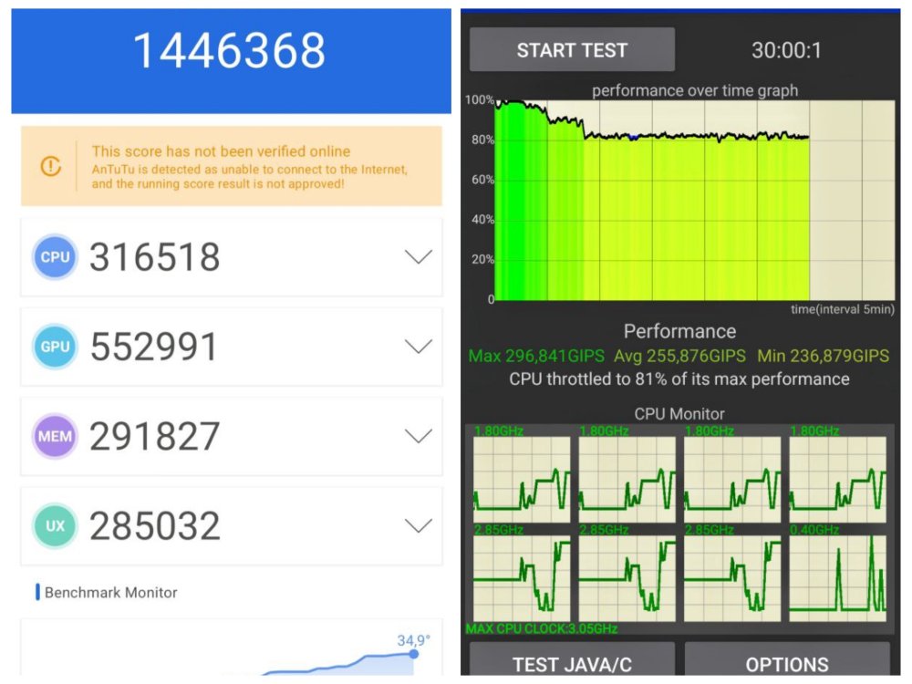 Троттлинг и охлаждение тоже вполне на уровне: испарительная камера площадью 6050 мм² обеспечивает хорошее охлаждение и незначительный троттлинг - падение производительности за 30 минут стресс-теста составило всего 20%.