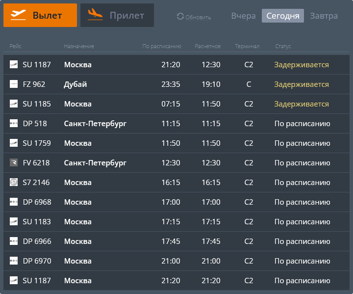 По данным онлайн-табло, по расписанию не смогли прилететь самолеты из Дубая и Москвы. Вылеты в обратном направлении также пришлось перенести.