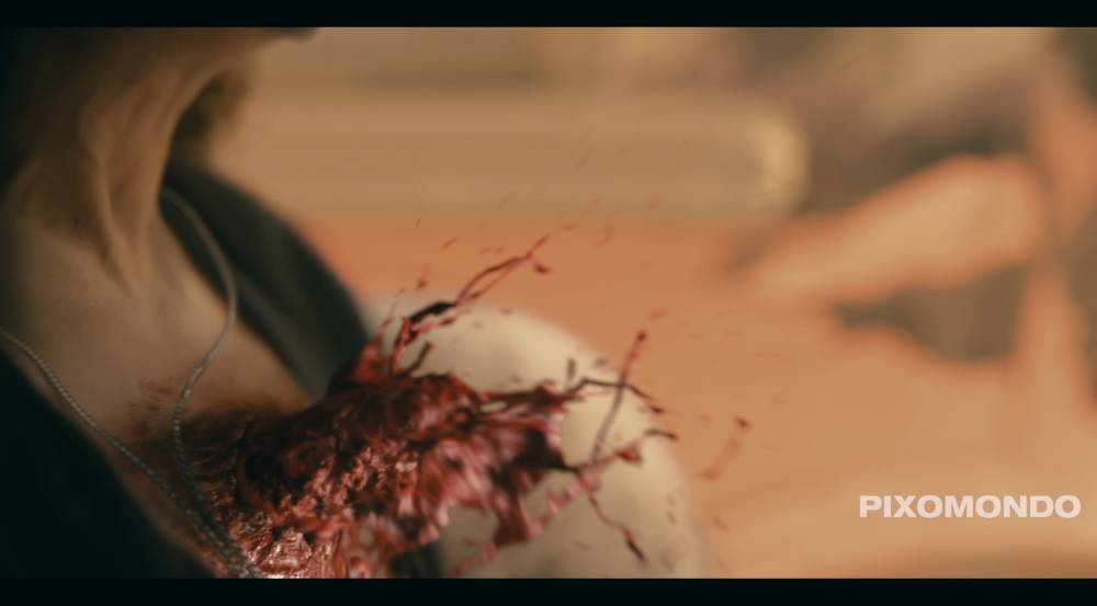 Вот мои первые шоты в студии. Ребята из FX-департамента не смогли добиться необходимой консистенции крови — в кадре она больше похожа на клубничное варенье. Именно это я и пытался замаскировать футажами.