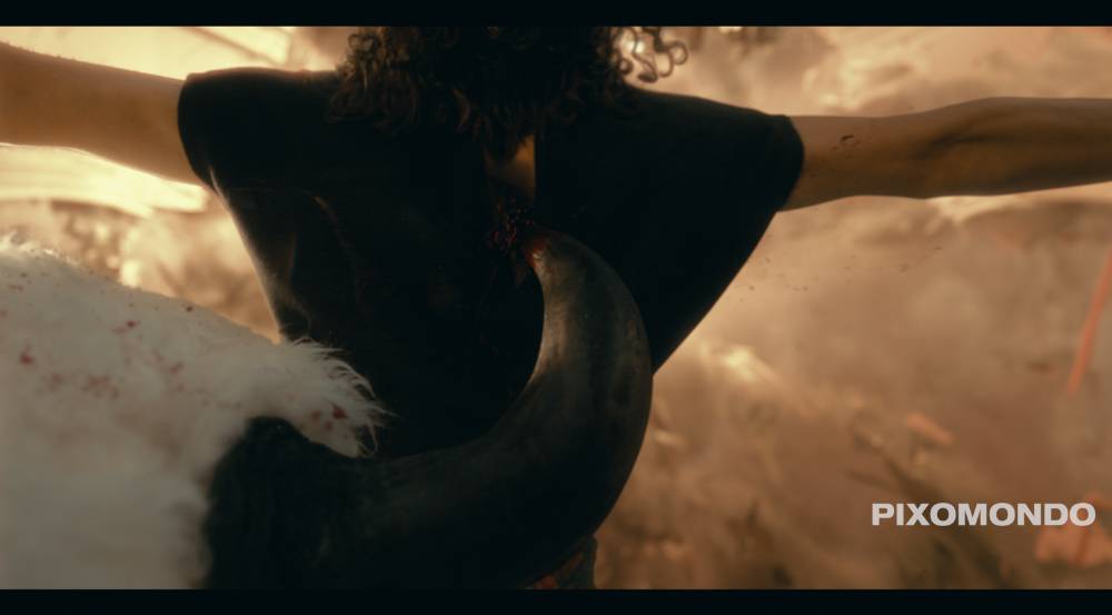 Один из моих любимых кадров — тот, где герой Джейсона Момоа пронзает противнику голову мечом через рот. Здесь я занимался доработкой оружия: во время съемок никакого лезвия, конечно, не было. Яблоко — тоже CG, как и кровь и даже часть подбородка.