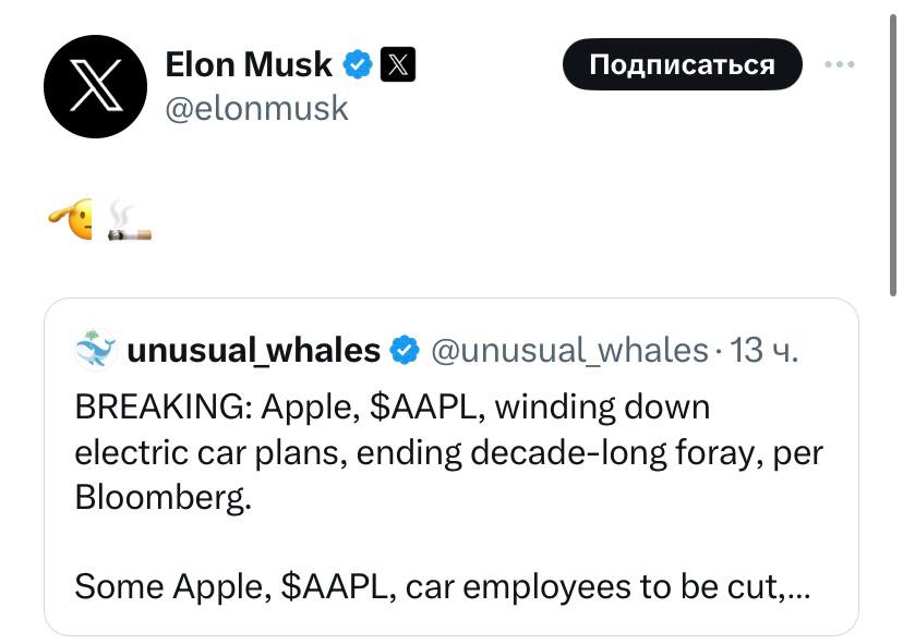 Теперь яблочный бренд сконцентрируется на развитии технологий ИИ. Но «провалу», похоже, уже радуется генеральный директор Tesla.