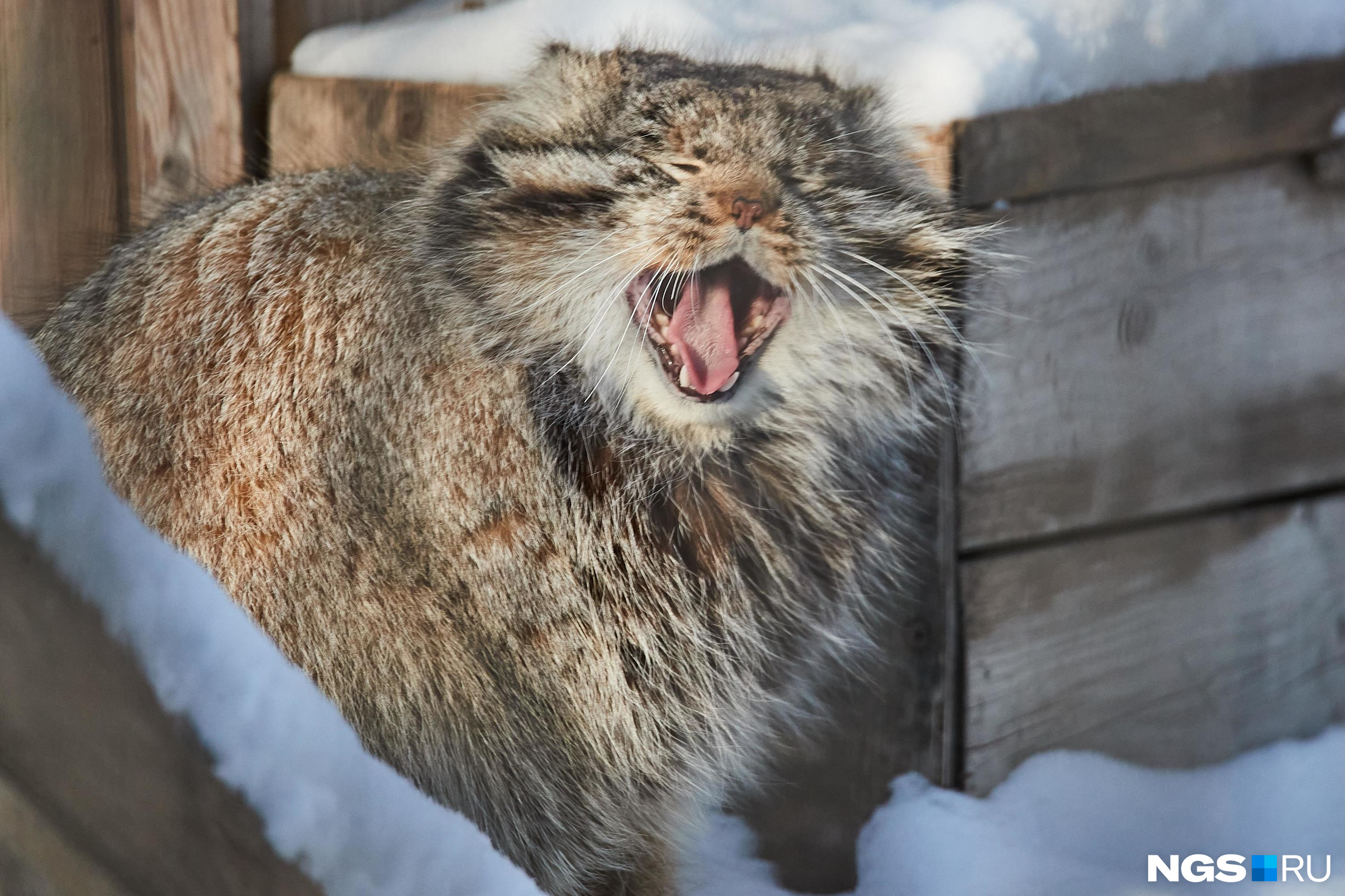 В Новосибирском зоопарке манулы сладко зевают, пока горожане прячутся от морозов в офисах и домах. Дикие коты могут переносить морозы до -50 градусов, и все благодаря своей богатой шубке.