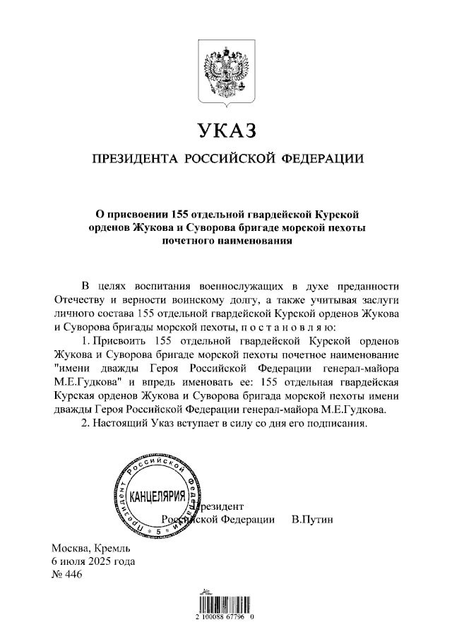 ▪️Указом Президента РФ 155-я отдельная гвардейская Курская орденов Жукова и Суворова бригада морской пехоты удостоена почётного наименования «имени дважды Героя Российской Федерации генерал-майора М.Е. Гудкова».