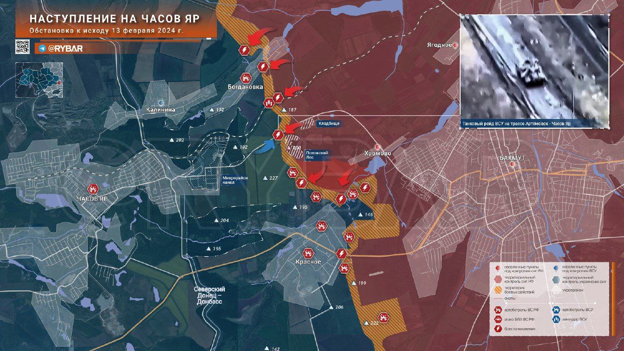 Российские войска продолжают наступление в направлении Часов Яра. Штурмовые отряды ВС РФ смогли расширить зону контроля к югу от Поповского леса, отодвинув противника от Хромово.