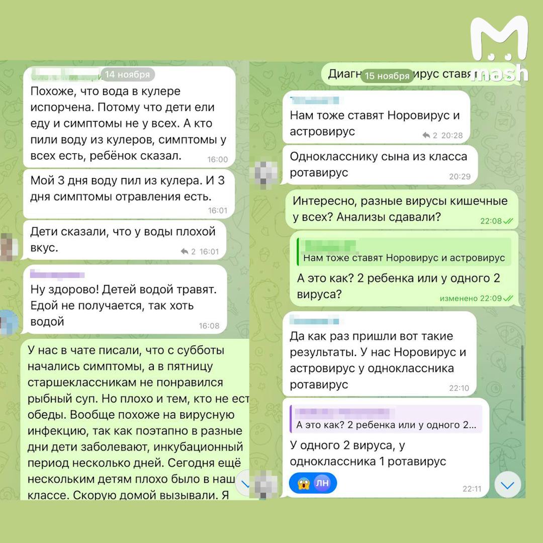 Со слов родителей, дети начали жаловаться на плохое самочувствие ещё в начале прошлой недели, но педсостав никаких мер не предпринимал и не разрешал забирать детей домой. Под конец учёбы в четверг (14 ноября) детей начало тошнить и поносить. В каждом классе было минимум 1-2 человека с такими симптомами.