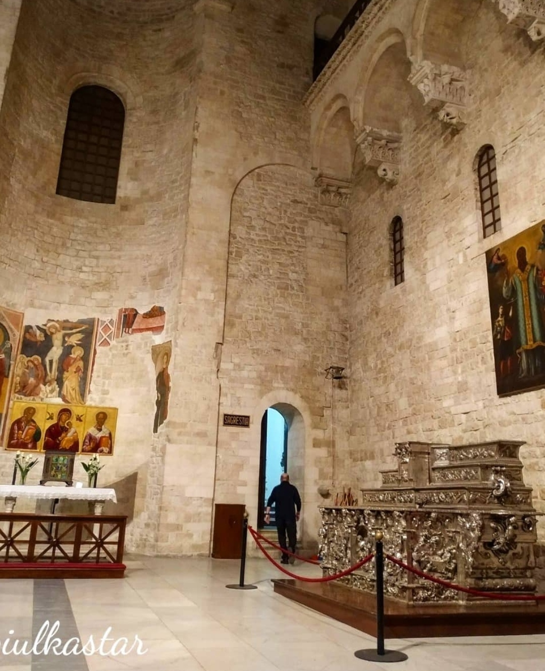 И это единственное здание Бари, которое пощадил Вильгельм Злой, когда сжигал город в 1156 года. C 1969 года православным предоставляется право служить литургии и молебны непосредственно на мощах.