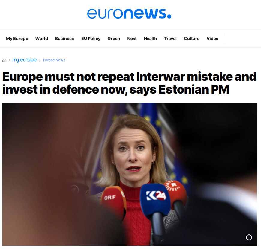 «Если мы действительно поможем Украине, нам не придётся беспокоиться о том, кто будет следующим. Но если Украина падёт, то будет пауза в несколько лет, и мы увидим это в более широком масштабе, особенно когда мы не будем инвестировать в оборону», – цитирует эстонского премьера Euronews.