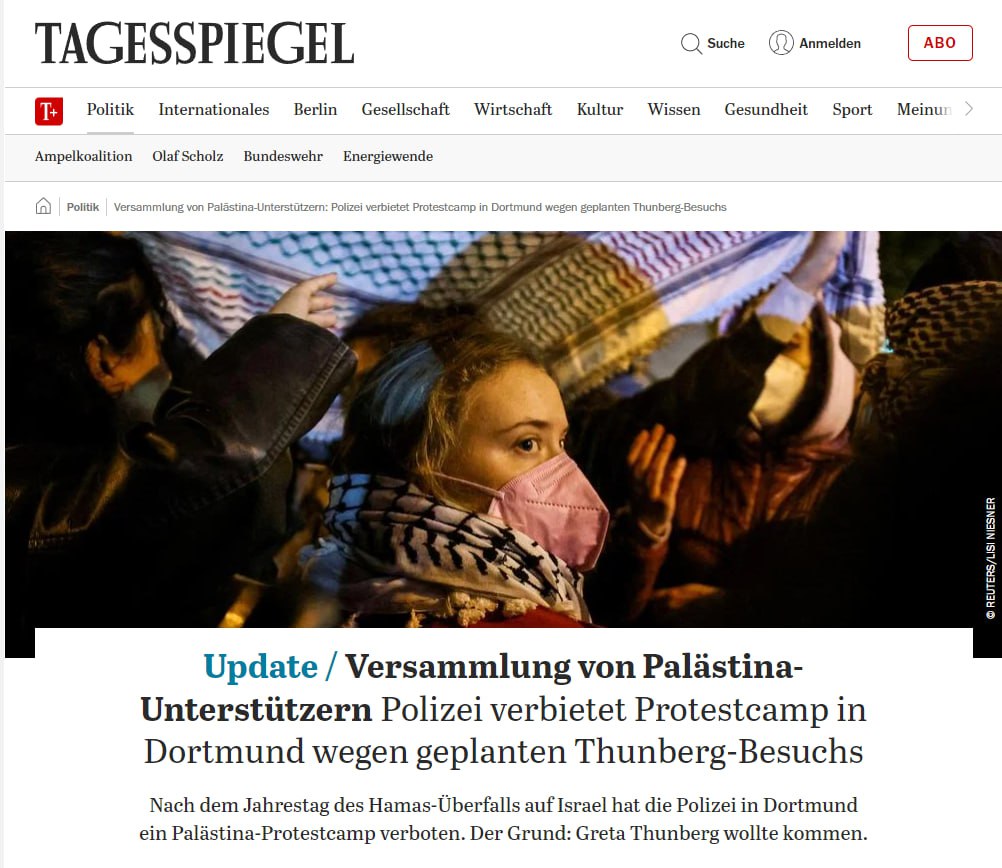 В результате полиция Дортмунда запретила палаточный лагерь протестующих в поддержку Палестины, узнав, что туда едет экоактивистка. Власти испугались, что Грета учинит беспорядки.