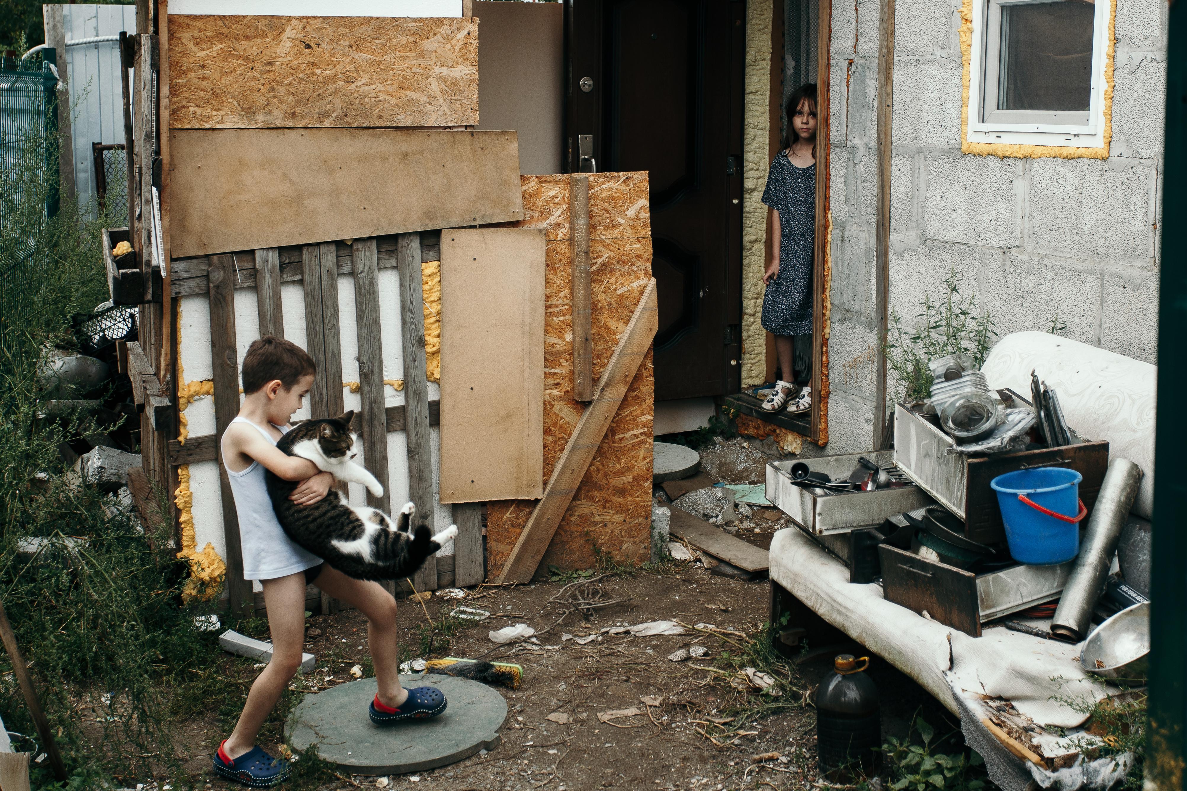 Дом у Тихолазовых окружен высоким забором из профлистов. Перед входом лежат детские велосипеды, сковородки, которые спасли из дома, какие-то провода и многое другое. Все пространство вокруг завалено вещами. В ряд во дворе стоят три постройки. Сгоревший дом, от которого пахнет гарью даже спустя полтора месяца. Сарай, в котором живет семья. Новый дом, который строит глава семьи.