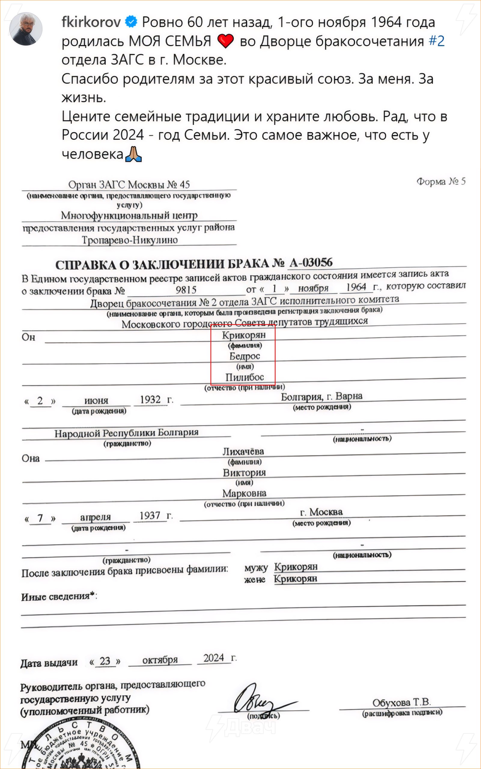 Выписан из болгар: Филипп Киркоров выложил свидетельство о заключении брака родителей, из которого стало известно, что его батю звали…