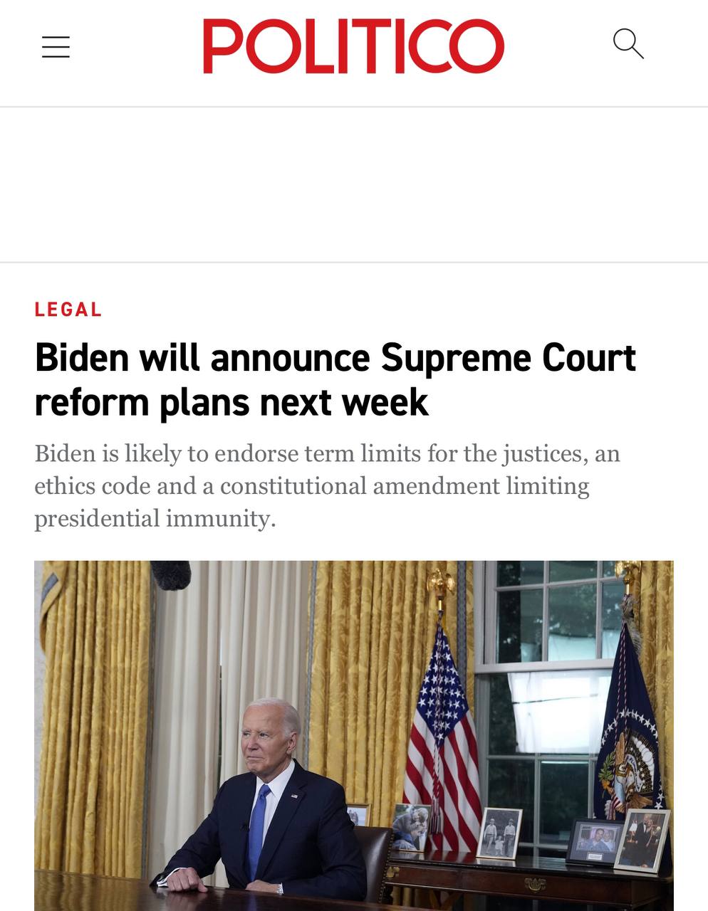 Он планирует поддержать ограничение сроков полномочий судей, принятие обязательного кодекса этики и поправку к конституции, ограничивающую президентский иммунитет, благодаря которому Дональд Трамп на время президентской гонки смог отсрочить свое судебное преследование по делу о штурме Капитолия в январе 2021 года.