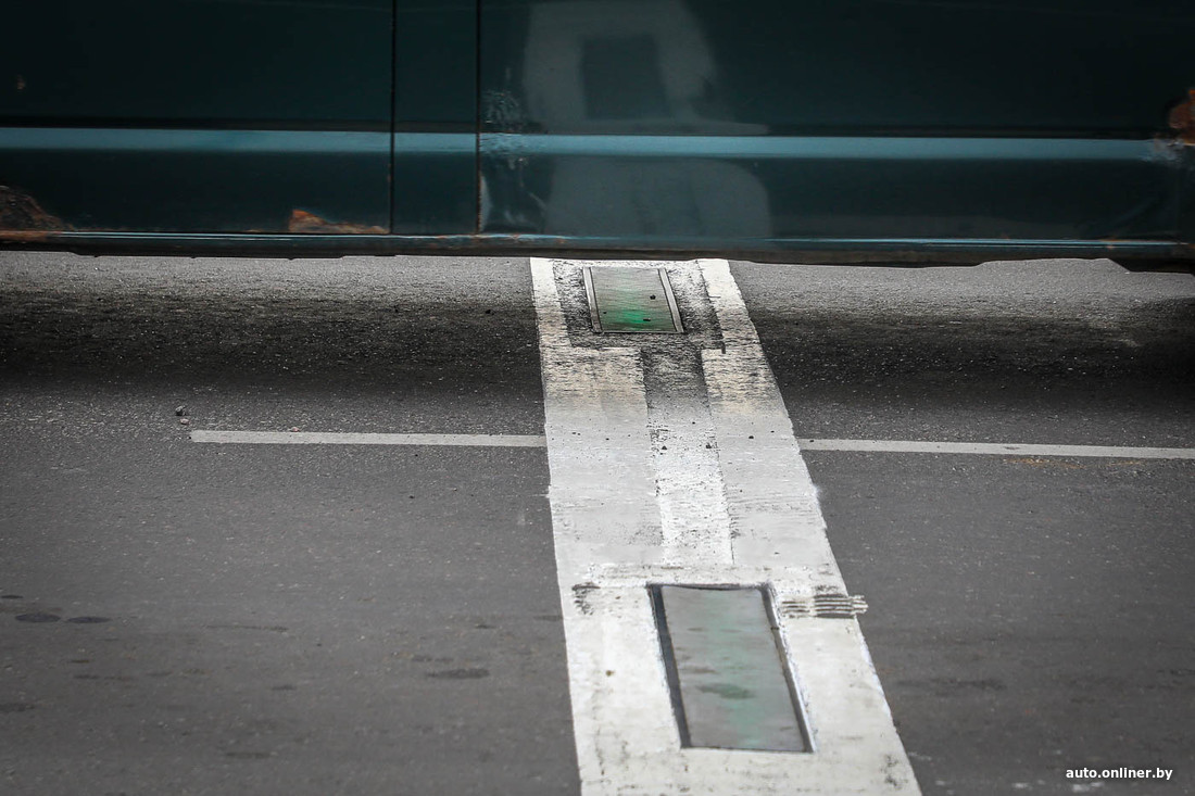 Светофор в тротуаре мы увидели. А еще увидели светофор (на этот раз автомобильный), вмонтированный в асфальт проезжей части. Эксперимент реализован на пересечении улиц Кожара и Мазурова. Аналогов в стране нет, утверждает ГАИ.