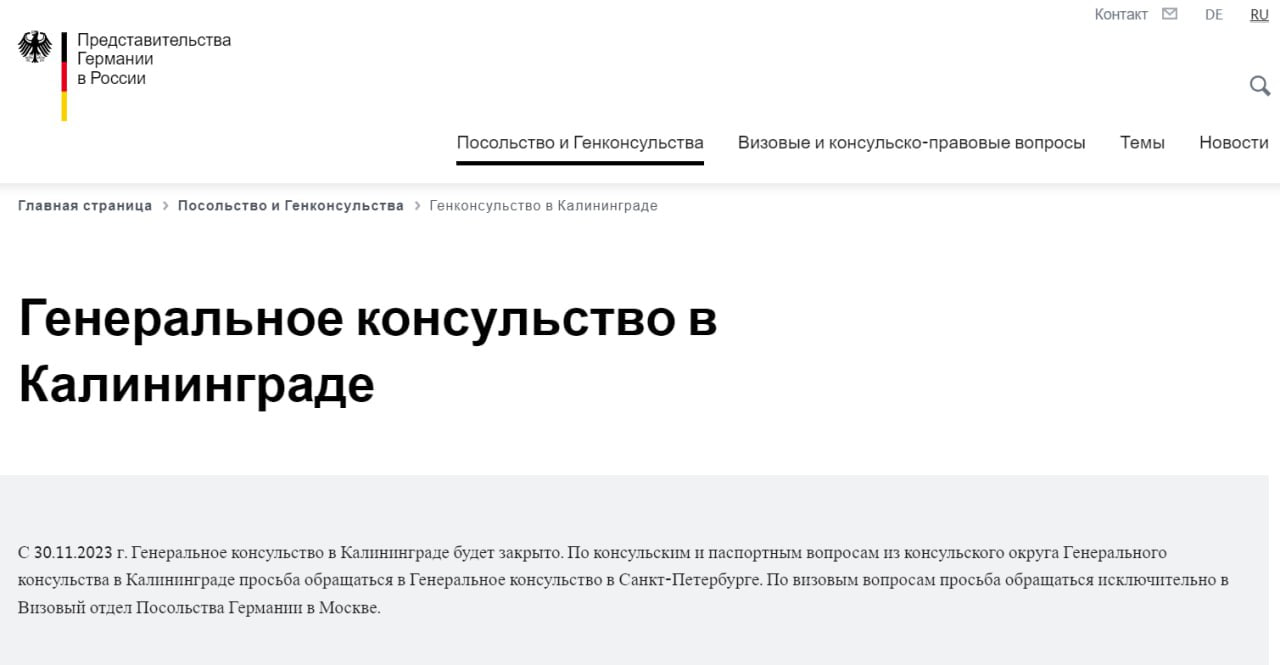 🇩🇪❗️ Генеральное консульство Германии в Калининграде закрывается с 30 ноября, оно работало с 2004 года.