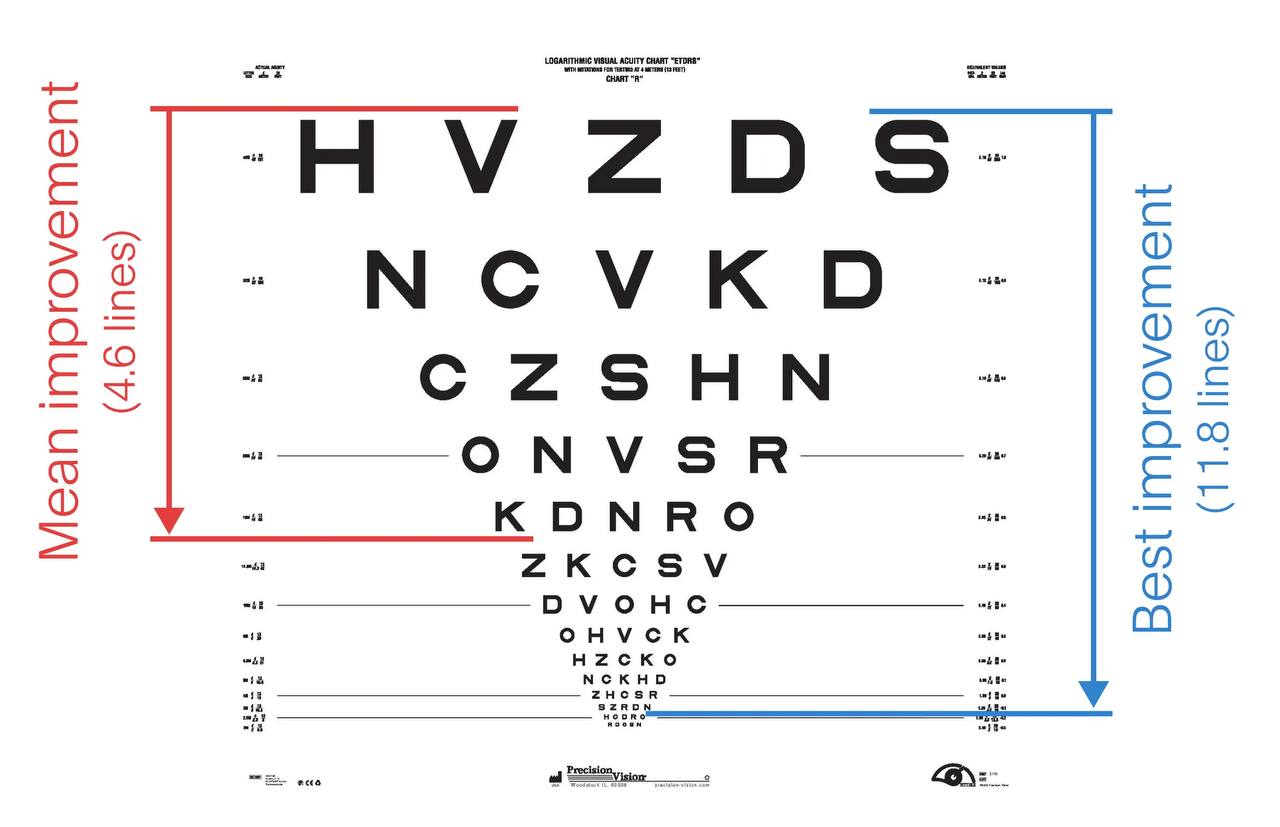 • Имплант вернул зрение в норму — в среднем пациенты стали видеть на 23 буквы (4.6 строки) больше.
