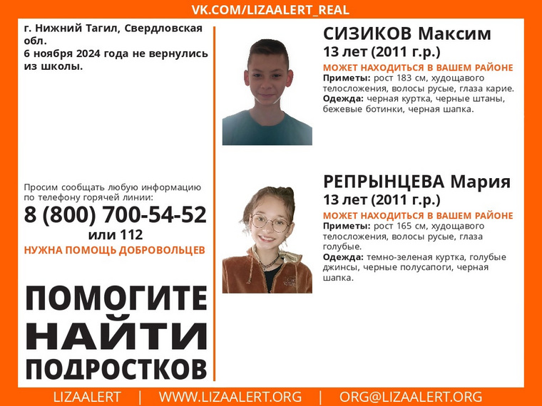 В Нижнем Тагиле 6 ноября не вернулись из школы 13-летние Максим Сизиков и Мария Репрынцева. Детей не могут найти вторые сутки. Об этом рассказали в поисково-спасательном отряде «ЛизаАлерт».