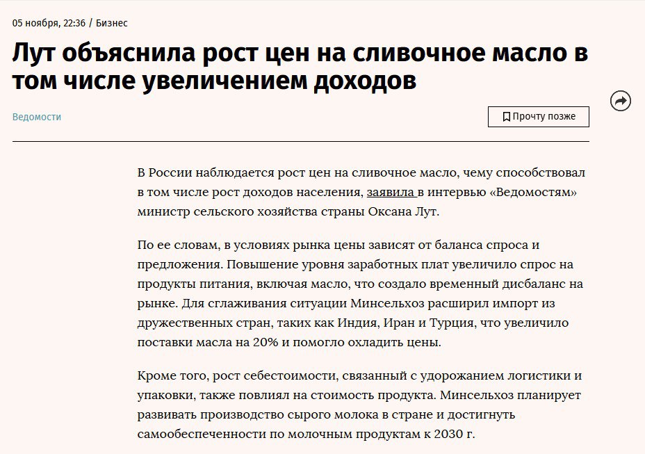 Министр сельского хозяйства России Оксана Лут заявила, что масло в стране подорожало из-за увеличения доходов россиян… Скупают дескать всё масло на корню, нехорошие такие россияне, из-за того, что денег валом и девать им их некуда… Серьёзно? Вот так вот оно действительно?