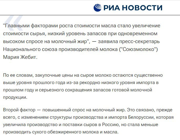 Читаем пресс-секретаря Национального союза производителей молока («Союзмолоко») Марию Жебит;