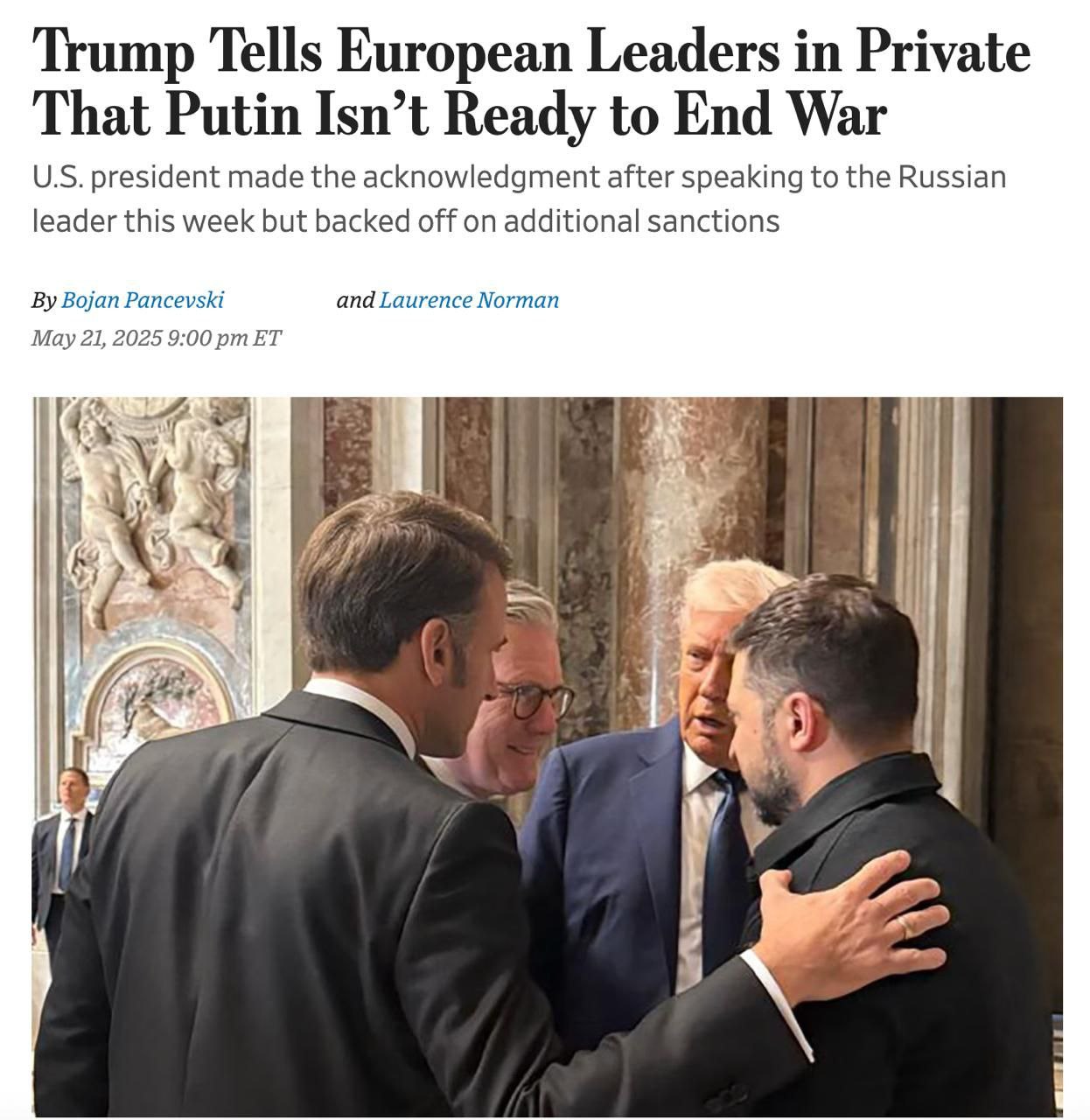 Трамп сказал европейским лидерам, что «Путин не готов закончить войну, потому что думает, что побеждает». Ранее Bloomberg давал иную цитату - что сам Трамп был убежден в победе РФ.