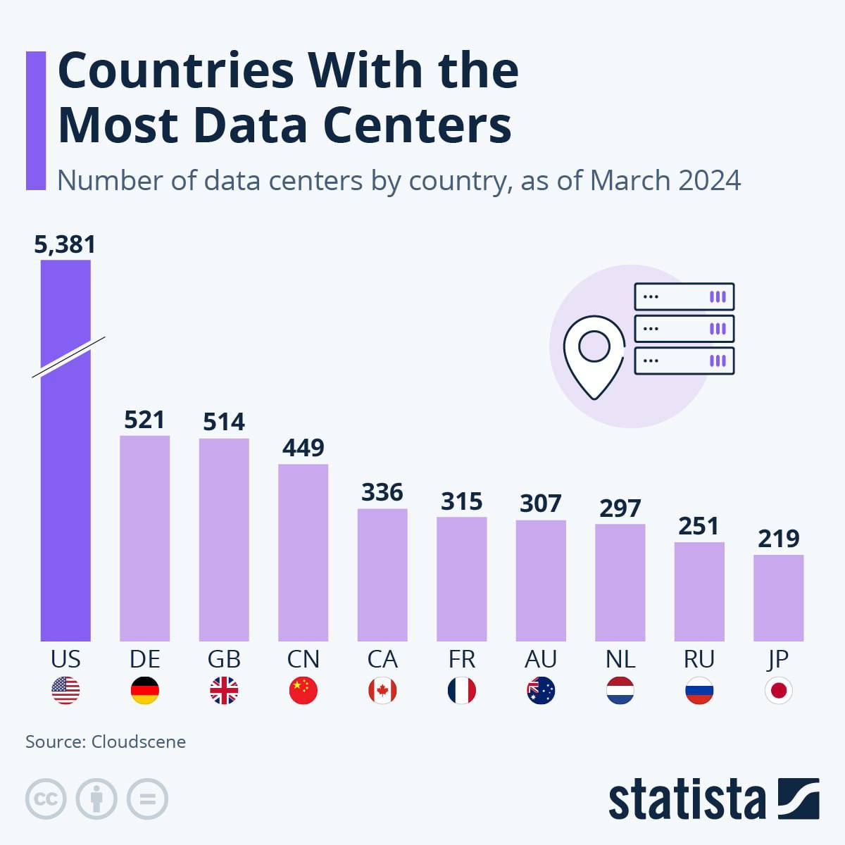 Китай находится только на 4 месте в мире по числу дата-центров, Россия — на девятом, опережая Японию. Лидируют с колоссальным отрывом США, далее следуют Германия и Великобритания.