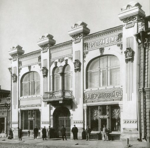 Первый торгово-офисный центр нашего города. Первый его этаж занимали магазины, а второй — различные конторы: Трамвайное бюро, Общество взаимного кредита и даже два смешанных приходских начальных училища.