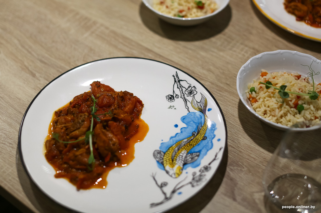 Получив по порции «Ракова» и «Намасте», отправляемся в зал. Первым делом пробуем блюдо индийской кухни: фотограф Максим призывает не нарушать индийских правил и есть руками. Конечно, полное культурное погружение — это круто, но я все же тянусь за вилкой.