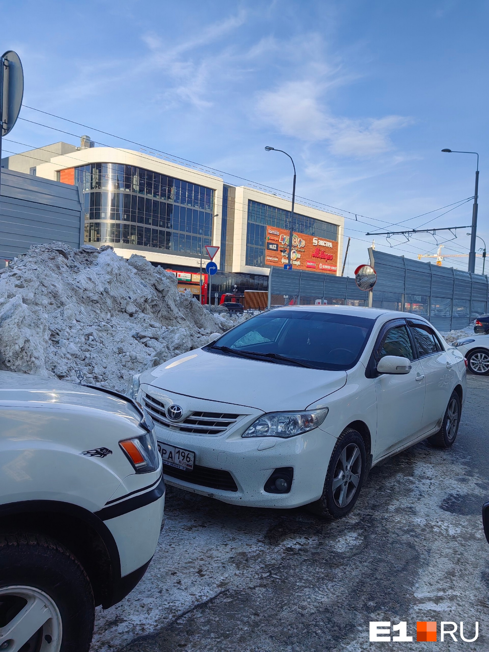 Возле трамвайных путей навалены кучи снега, поэтому при пересечении не видно, двигается ли по путям транспорт. О такой ситуации E1.RU рассказала читательница. По ее словам, у дороги стоит одно зеркало, но от него мало толку, щиты тоже мешают обзору.