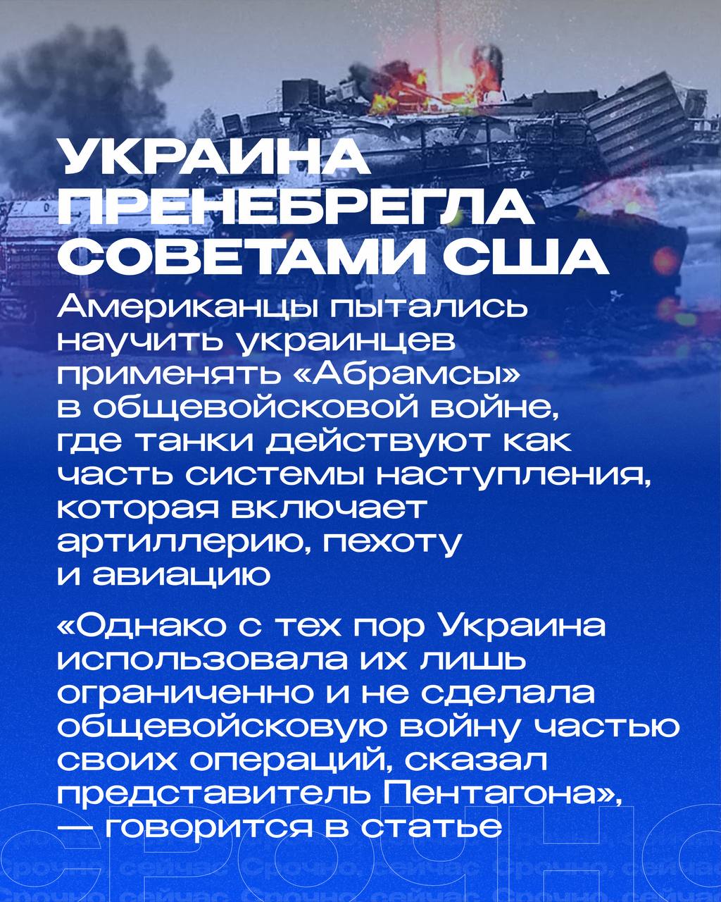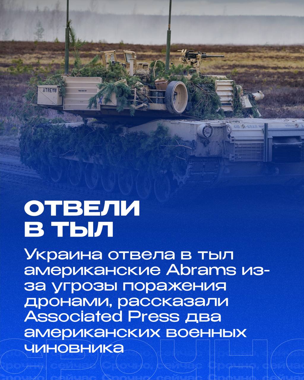 Из-за угрозы уничтожения российскими дронами Украина отвела в тыл американские танки «Абрамс». 5 из них украинцы уже потеряли под Авдеевкой. Одна из причин — в нежелании ВСУ обучаться по американским методичками. США давали советы, как воевать против России в условиях современной войны, но Украина пренебрегла ими☝🏻