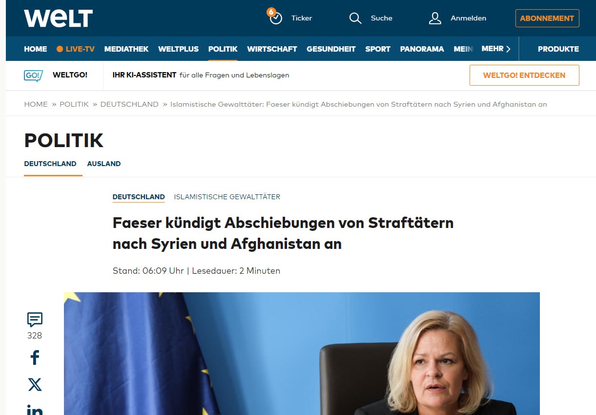 Об этом сообщила глава МВД ФРГ Нэнси Фезер в интервью газете Bild am Sonntag.