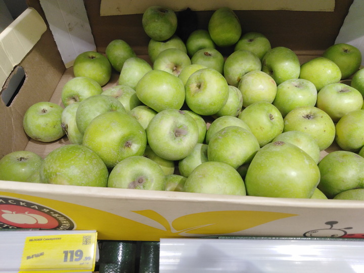 В гипермаркете «Ашан» (ТЦ «Оранжевый») сорт «ред чиф» стоит 159,9 рублей, «крипс пинк» - 169,9 рублей за кг, «симиренко» - 139,9 рублей за кг. Сезонное яблоко - 109,9 рублей по акции. В сети магазинов «Магнит» «симиренко» по акции можно приобрести по 119,9 рублей кг.