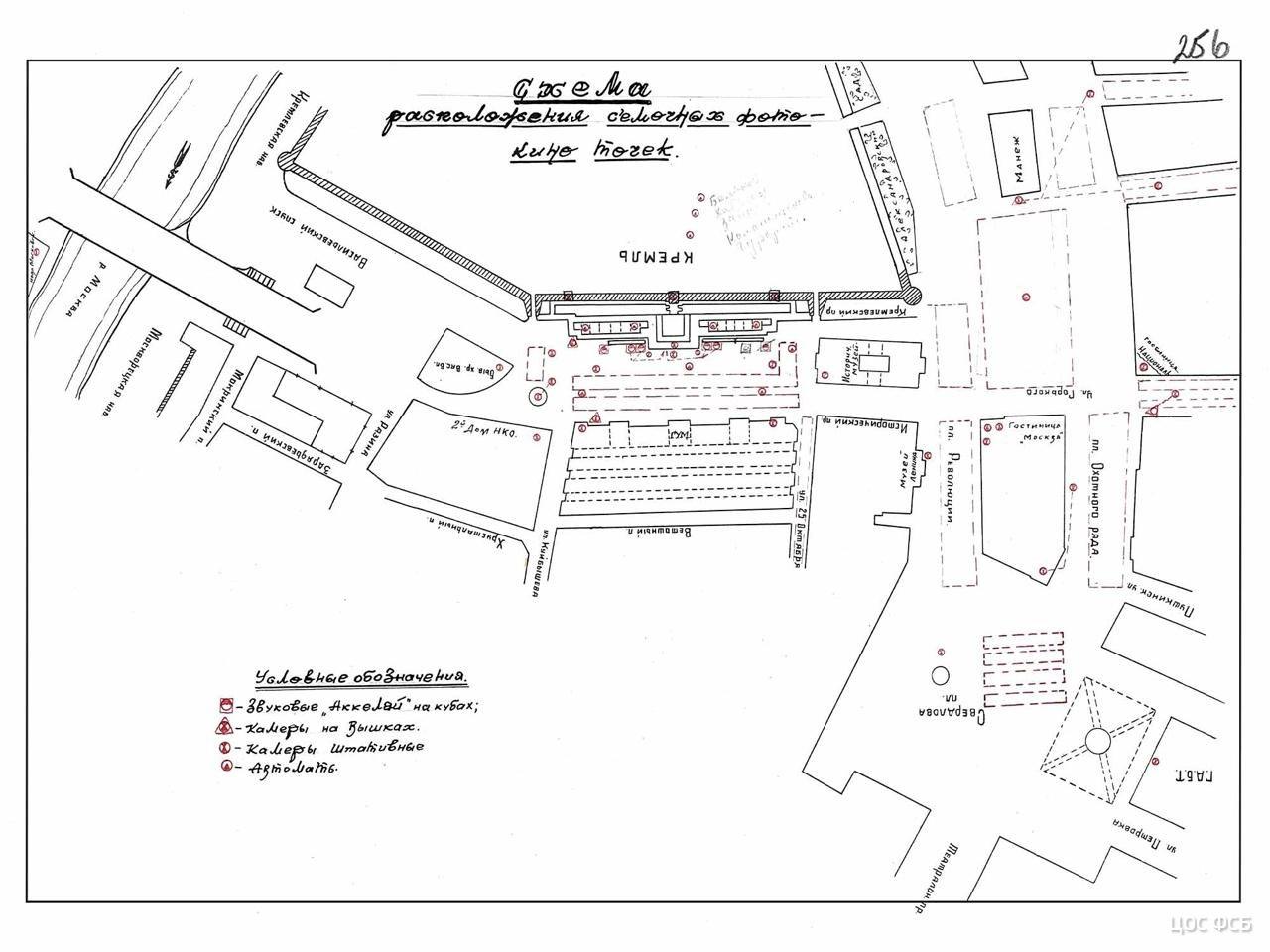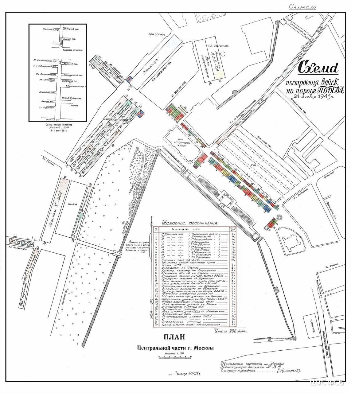 В документах приведена схема построения войск на Параде Победы, на которой различным цветом обозначены парадные расчеты фронтов и родов войск Красной армии и Военно-морского флота, а также места стоянки боевой техники и вооружения.