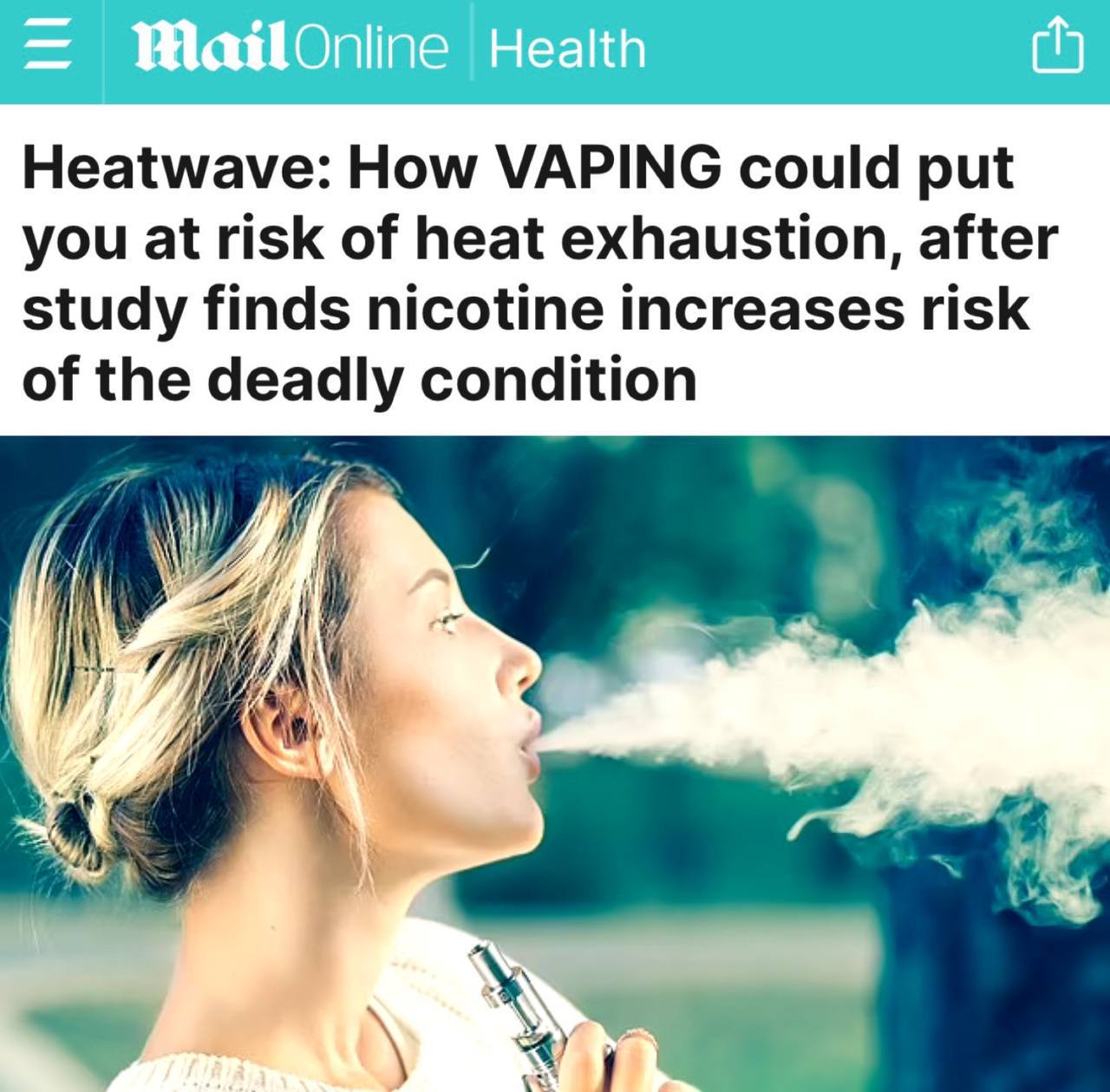 Вейпинг и курение увеличивает «тепловую нагрузку» во время прогулок, физической активности, что приводит к тепловому истощению за счет уменьшения притока крови к коже. Никотин сужает кровеносные сосуды, в результате чего к коже поступает меньше крови. Приток крови к коже позволяет организму выделять тепло и поставлять жидкость для пота.