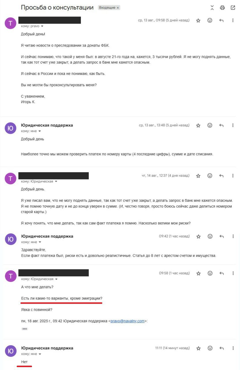 Эмиграция — единственный вариант для донативших ФБК*, признали в самом фонде, пишет Sota**. В переписке ФБК подтвердил, что риски для донативших в разное время «есть и довольно реалистичные. Статья до 8 лет с арестом счета и имущества». На вопрос о том, есть ли варианты, кроме эмиграции, последовал лаконичный ответ: «Нет».