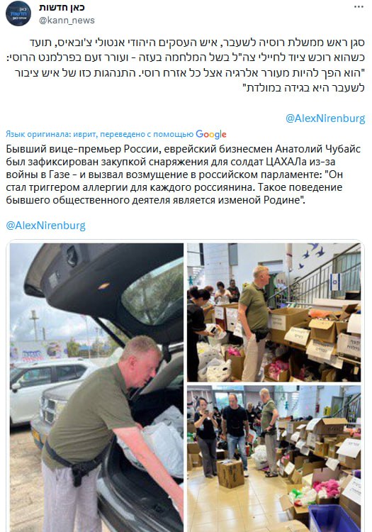 Ранее в сети появились фото, на которых Чубайс занимается гумпомощью в Израиле. Хамзаев обратил внимание на то, что бывшему чиновнику «стало невыносимо в России», когда она встала на защиту своего суверенитета и жителей Донбасса от Украины: