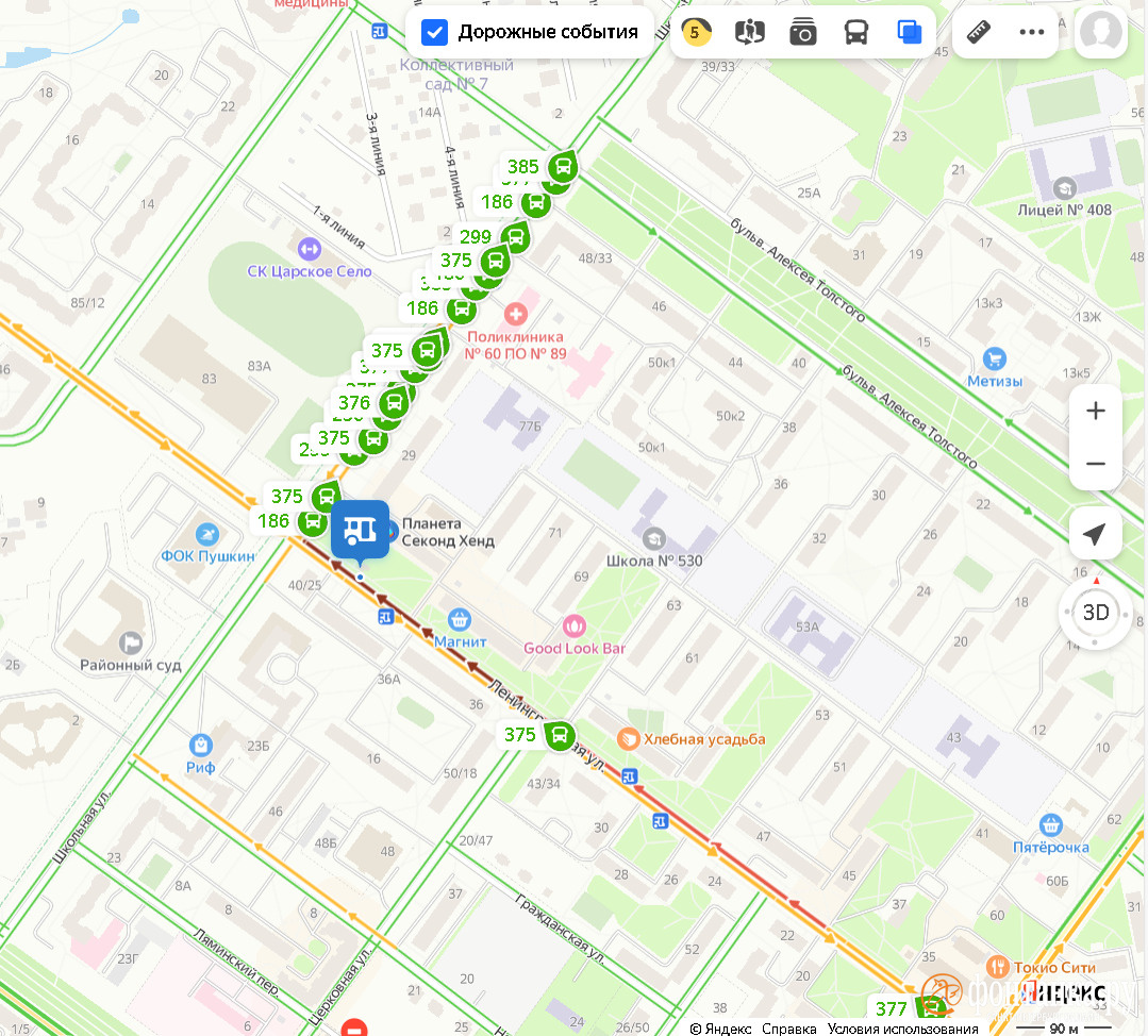 «В Пушкине сковало основную улицу движения автобусов из-за аварии на перекрёстке — встало уже больше 20 автобусов», — пишет очевидец в «ДТП и ЧП | Санкт-Петербург». На «Яндекс.Картах» с 13 часов до 13:20 можно было насчитать около 20 автобусов, стоящих в пробке на Школьной. Среди них маршруты № 186, 375, 381, 376, 299. А на Ленинградской улице скопился плотный затор со стороны Оранжерейной улицы.