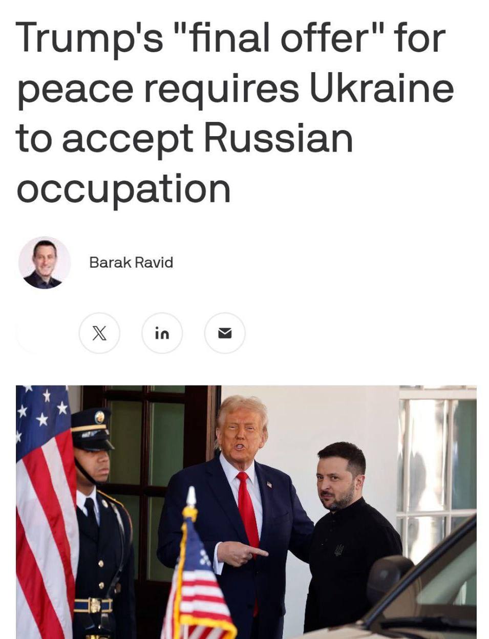 ◾️Одностраничный документ описывается как «окончательное предложение» Трампа. Белый дом настаивает, что выйдет из переговоров, если стороны не заключат сделку в ближайшее время.