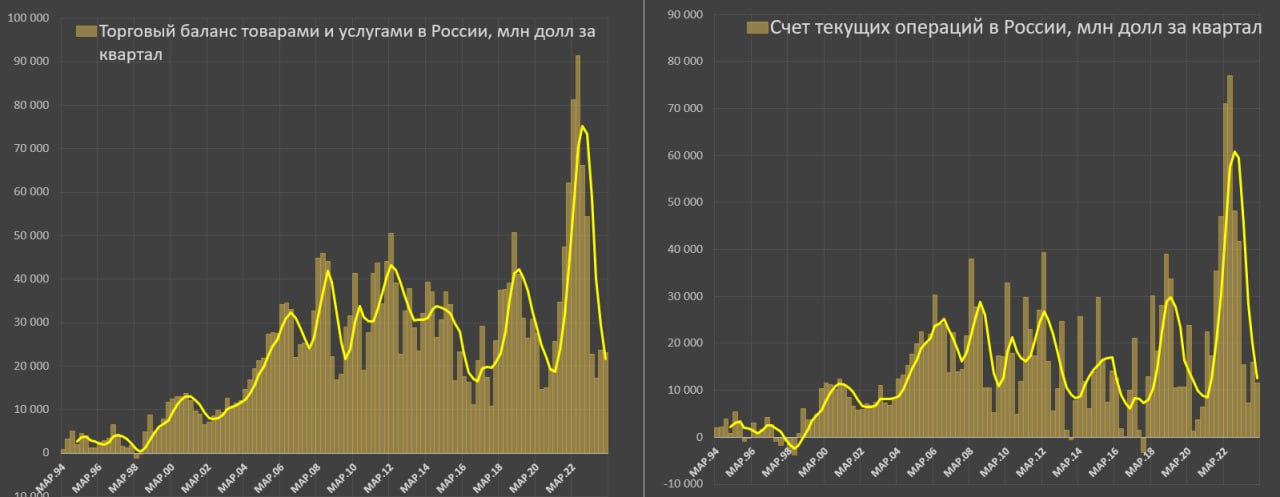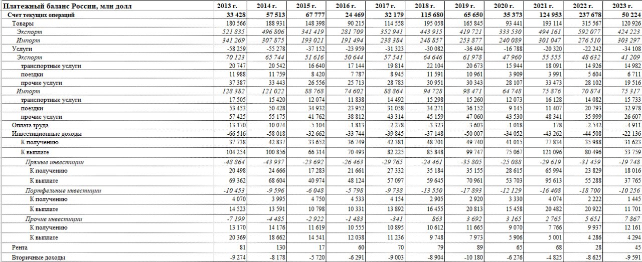За 2023 год по обновленным данным Банка России счет текущих операций (СТО) составил $50.2 млрд, что почти в 5 раз в сравнении с рекордным профицитом на уровне $237 млрд в 2022, $125 млрд в 2021 и в среднем $56 млрд в посткрымский период с 2015 по 2020 включительно.