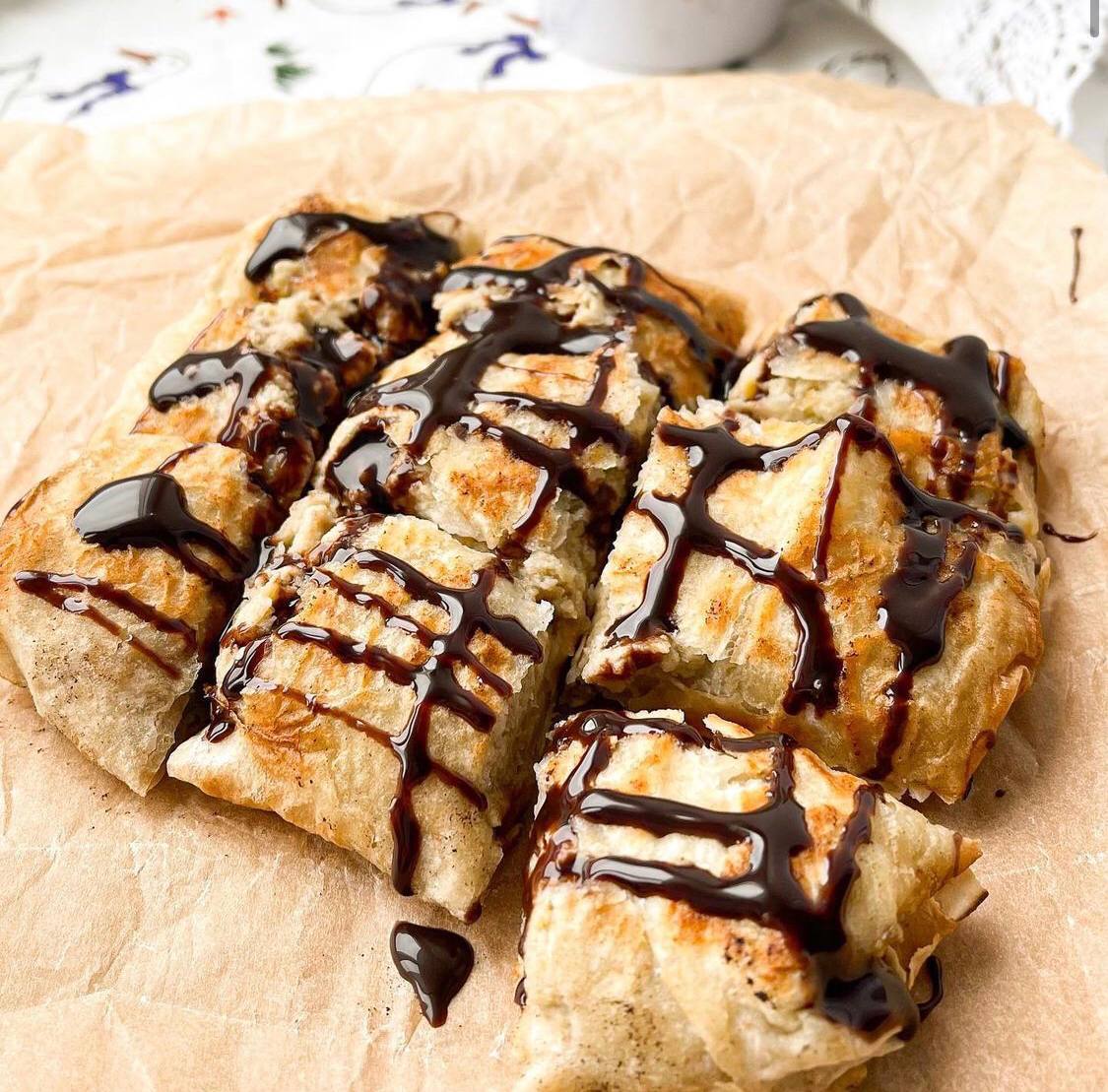 3. Выложить лаваш на сковороду, по центру банановую массу, свернуть в конверт и запечь с двух сторон под крышкой.