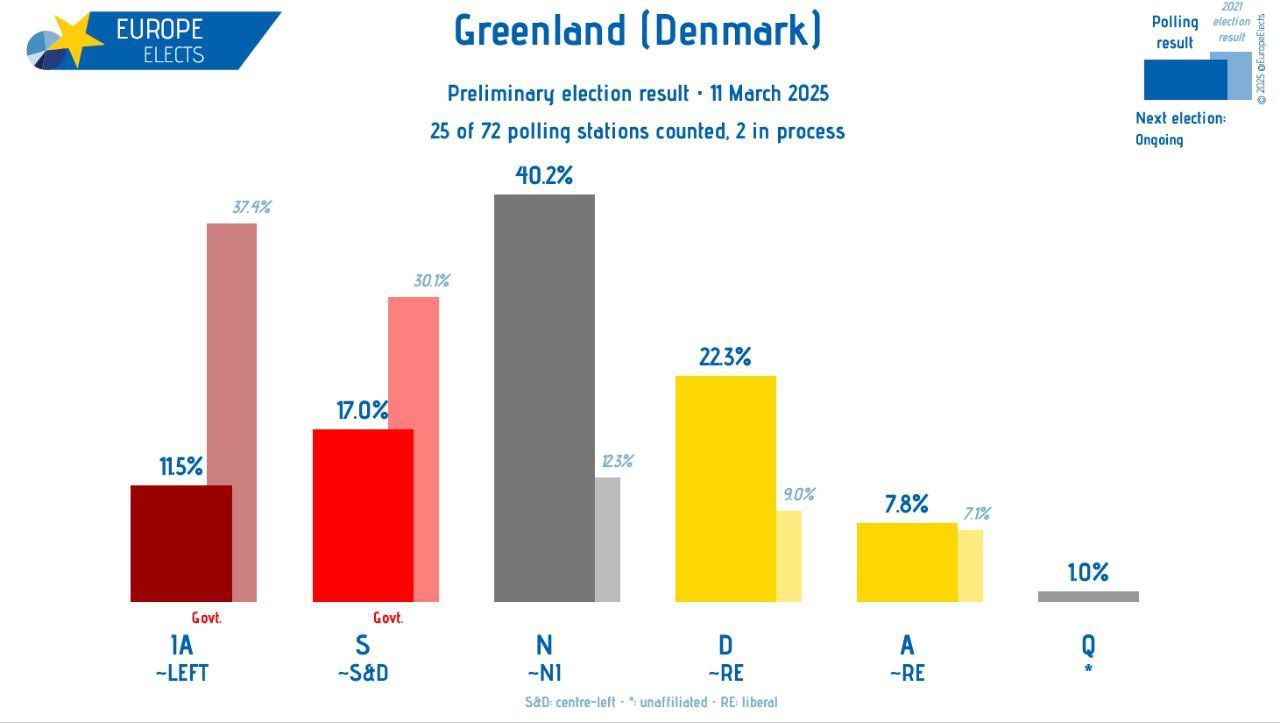 В ходе голосования в Гренландии оппозиционная центристская партия "Налерак" лидирует по предварительным результатам среди традиционных левых партий, выступающих за независимость.