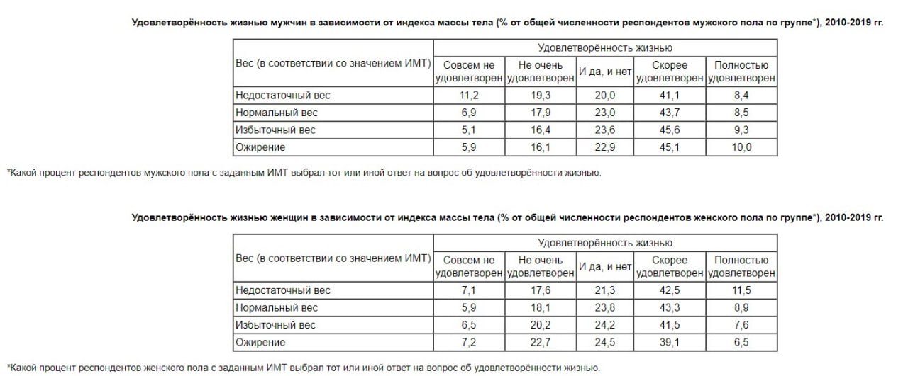 Чем больше дефицит веса у женщины, тем более она удовлетворена жизнью.
