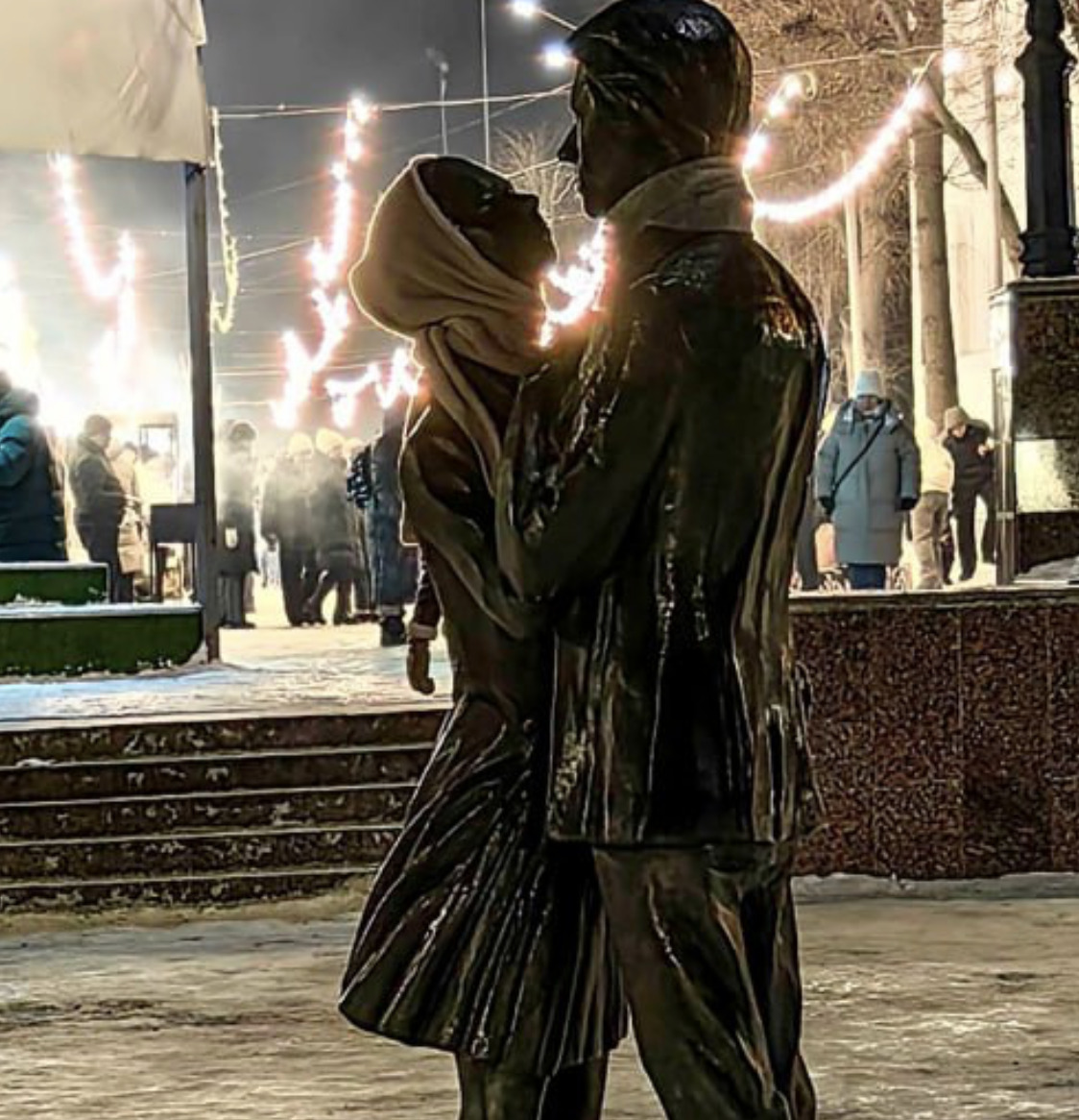 Горожане “утеплили” скульптуры влюбленных, установленные на Венце – кто-то не пожалел для них теплые шарфы.